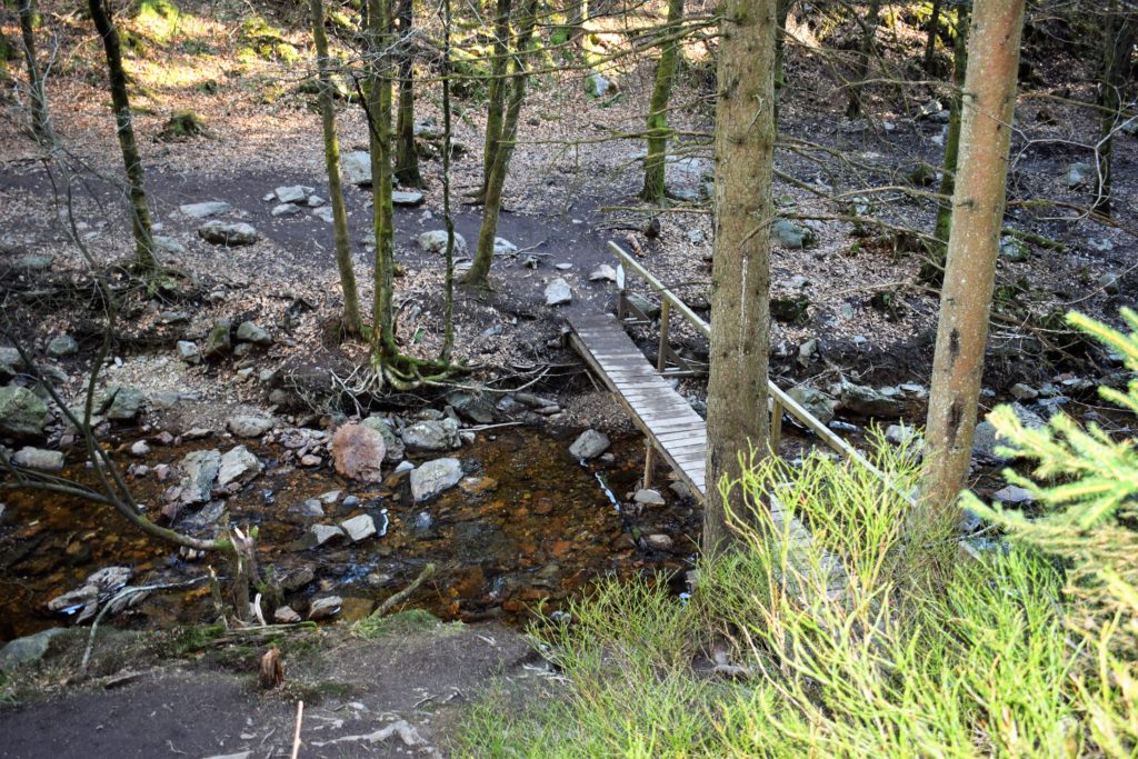 Nous commençons à remonter petit à petit toujours en suivant le cours de l’eau. Ce morceau est plus ouvert, plus éclairci. Nous sommes entourées d’arbustes. On se croirait ici dans la montagne. Ensuite, nous arrivons dans une nouvelle forêt de sapins, tout en haut. Celle-ci est moins dense que la première. Nous pensons que notre balade s’achève mais si nous avons passé la rivière une fois, il faut la passer une deuxième fois pour rejoindre notre point de départ.