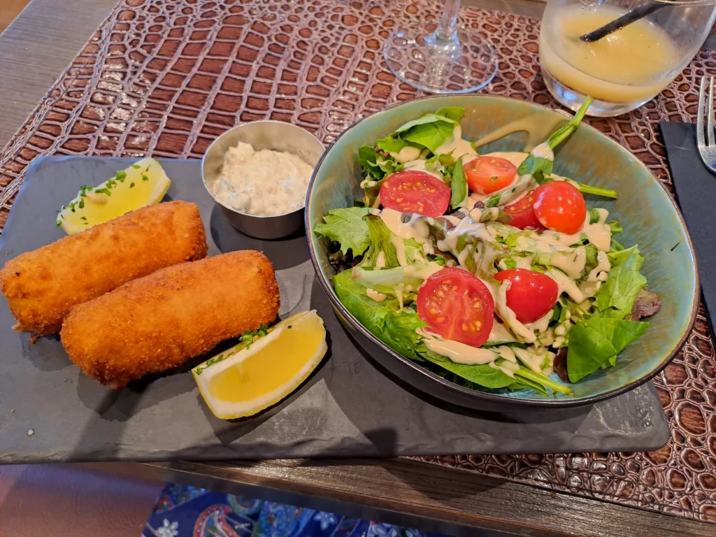 Nous profitons de notre première soirée pour descendre en ville. Il y a énormément de monde et on ne comprend pas tout de suite pourquoi. Nous trouvons de la place dans une brasserie : La Villa d’Hardelot. Nous sommes à la mer du Nord, nous décidons donc de prendre les croquettes aux crevettes servies avec une salade et des frites. C’est toujours une valeur sûre. En dessert, j’opte pour une soupe de melon et sa boule de glace avec une salade de fruits rouges et des morceaux de melon.