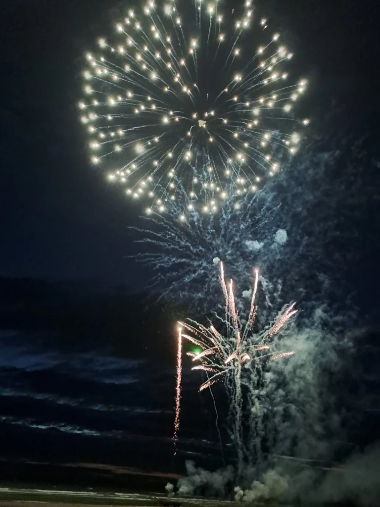 Après le repas, nous descendons vers la plage. Au fur et à mesure des minutes qui défilent, il y a de plus en plus de monde. Nous comprenons alors qu’il va y avoir un feu d’artifices. Une belle surprise, un spectacle gratuit qui nous fait passer une belle soirée sur la plage. Ici, on fait plutôt des feux d’artifices le 15 août, il semblerait qu’à Hardelot, on préfère la vieille et à notre surprise, le feu d’artifices a lieu le 14 août.