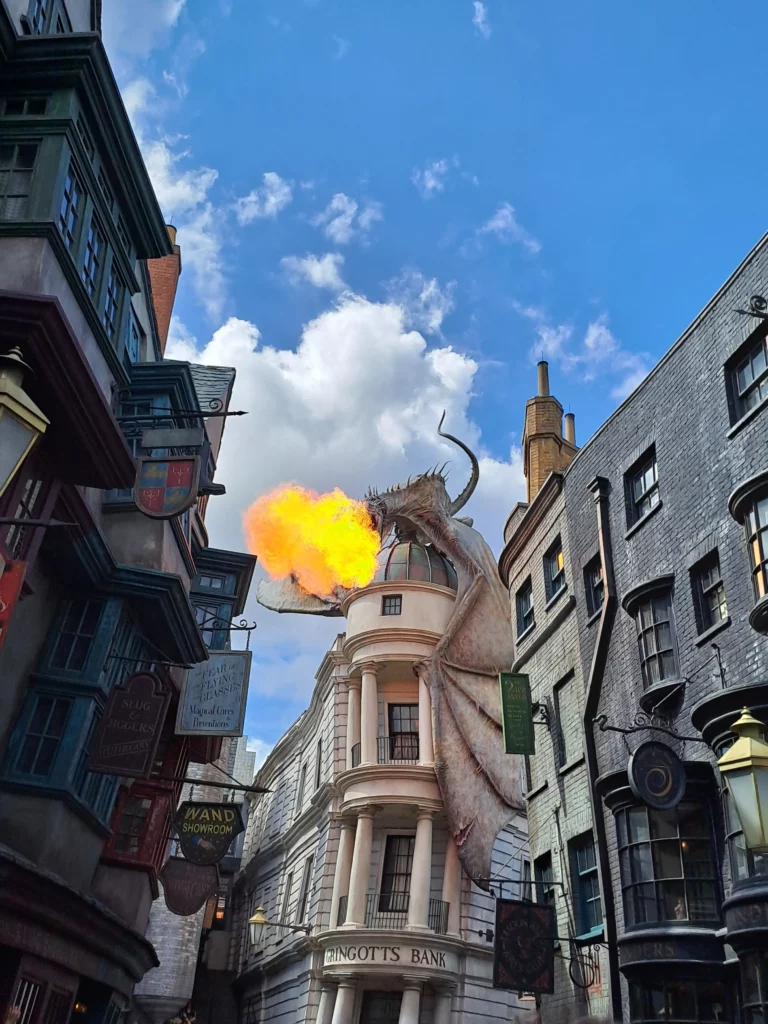 Dans ce premier parc, on rentre de plein fouet dans l’ambiance Harry Potter, en immersion total sur le Chemin de Traverse. Qu’on ait envie de se rafraîchir au Chaudron Baveur ou de manger des choco grenouilles, l’offre est juste énorme et fidèle aux films. La boutique des frères Weasley est hallucinante avec son pantin géant dont le chapeau se lève. Mais, le clou du spectacle, c’est vraiment l’énorme dragon qui trône au dessus de Gringotts et qui crache du feu toutes les 15 minutes.