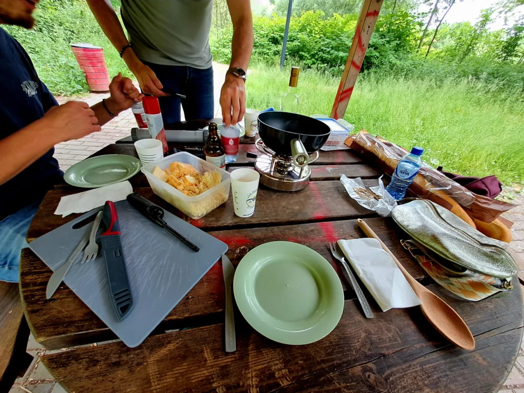 Dans notre sac à dos, nous avions un réchaud au gaz, un long briquet pour l’allumer, un caquelon, des allumettes pour si jamais le briquet ne marche pas, une recharge de gaz, des piques à fondue, des gobelets, des assiettes, une planche à découper, des couverts, une grande cuillère en bois pour mélanger et même un paravent pour protéger le gaz… et le principal … un tire bouchon.