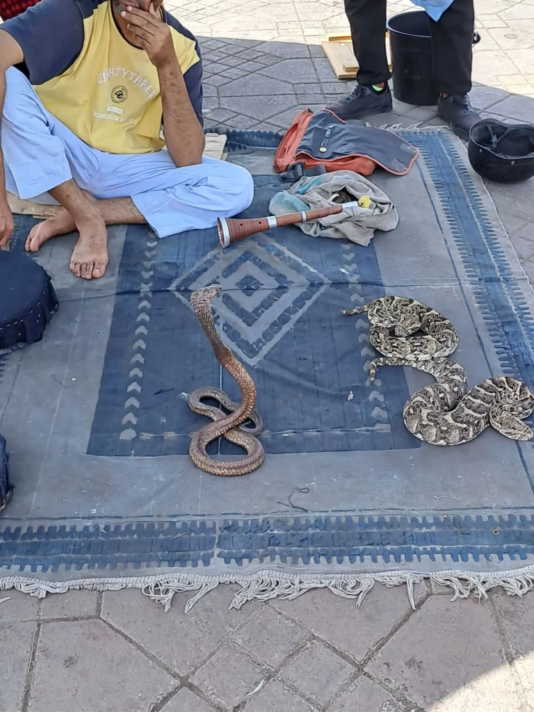 Je me suis arrêtée 2 minutes devant un dompteur de serpents qui m’a proposé de prendre les serpents en photos. Il m’en a mis un sur l’épaule et après m’a réclamé 100 dirhams (10€). Je n’étais pas d’accord de payer car je n’ai rien demandé. De plus, il est interdit de mendier ou d’arnaquer les gens sur la place. La police touristique est là pour y regarder.