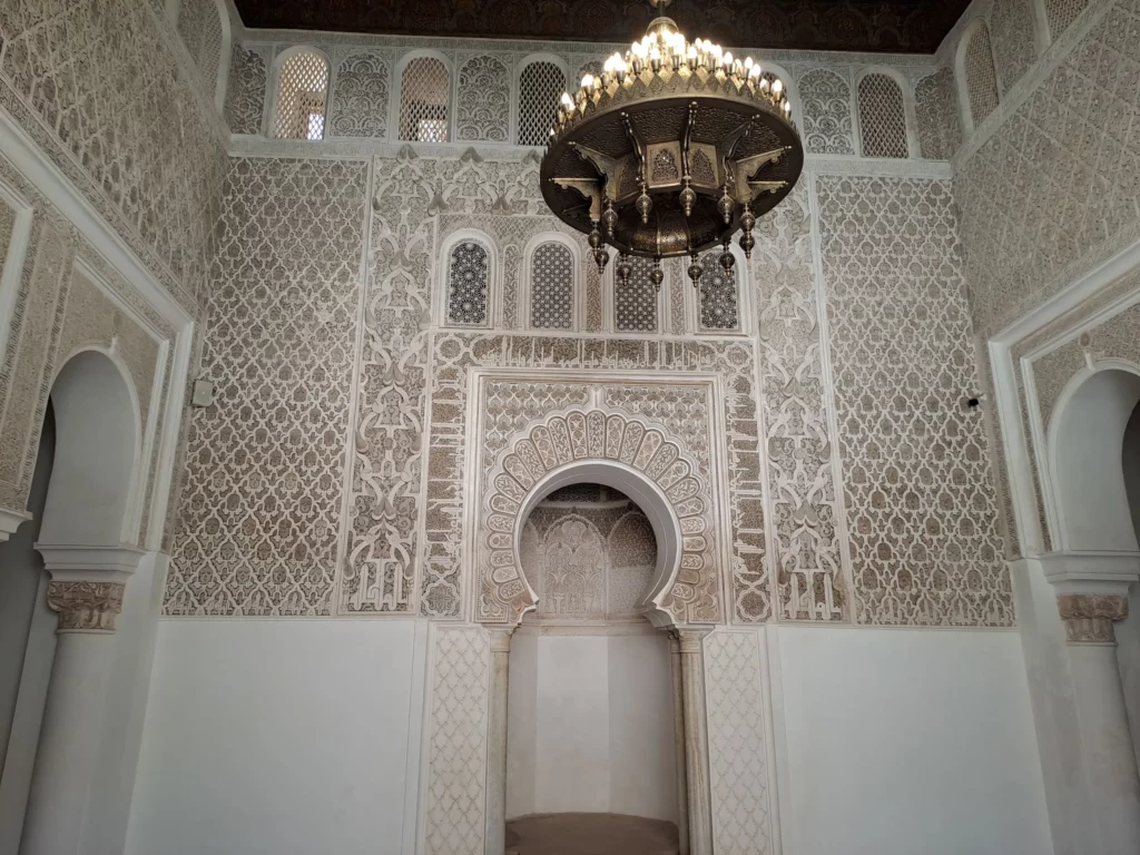 Dès l’entrée, on découvre de somptueux jardins remplis de fleurs, de bananiers et d’orangers. La cour est pleine de mosaïques et les détails sont juste waw. Tout est travaillé du sol au plafond. Il suffit d’ouvrir les yeux et de tout regarder à 360°. On y retrouve les différents matériaux de l’époque : le bois, le tadelakt, la mosaïque et le plâtre.